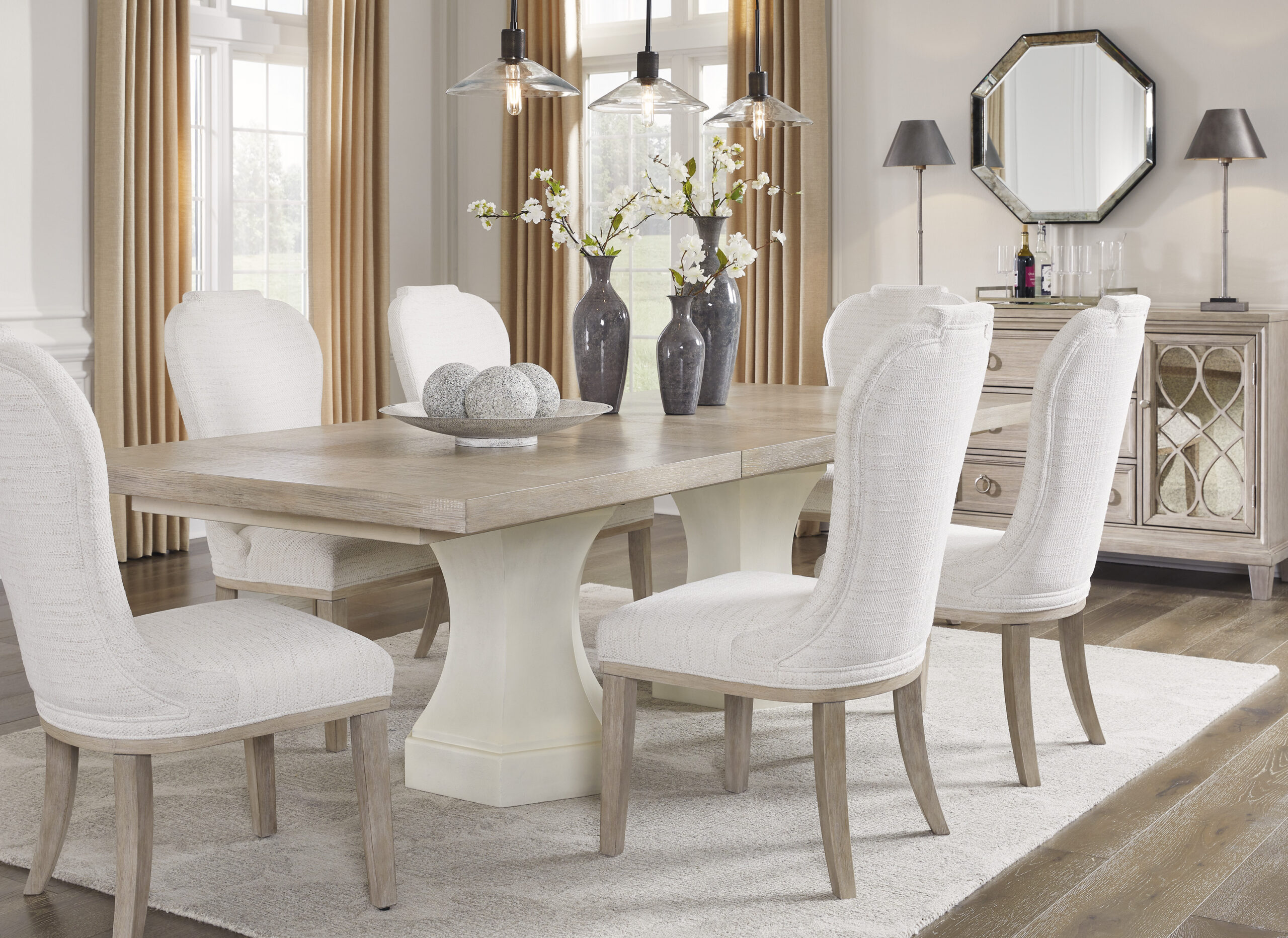 Komoda Jorlaina puikiai tiks valgomojo, miegamajo, prieškambario interjeruose. Ji yra universali, ją galite priderinti prie įvairių art deco stiliaus baldų. Ši valgomojo komoda turi keletą stalčių ir keletą spintelių. Baldas yra ant kojelių. Fasado spalva balinta ir truputį pasendinta, stalvirštis gražaus medinio rašto rusvas atspalvis. Komoda turi stilingas metalines rankenėles, kurių pagalba patogiai galėsite atidarinėti tiek stalčius, tiek spinteles.