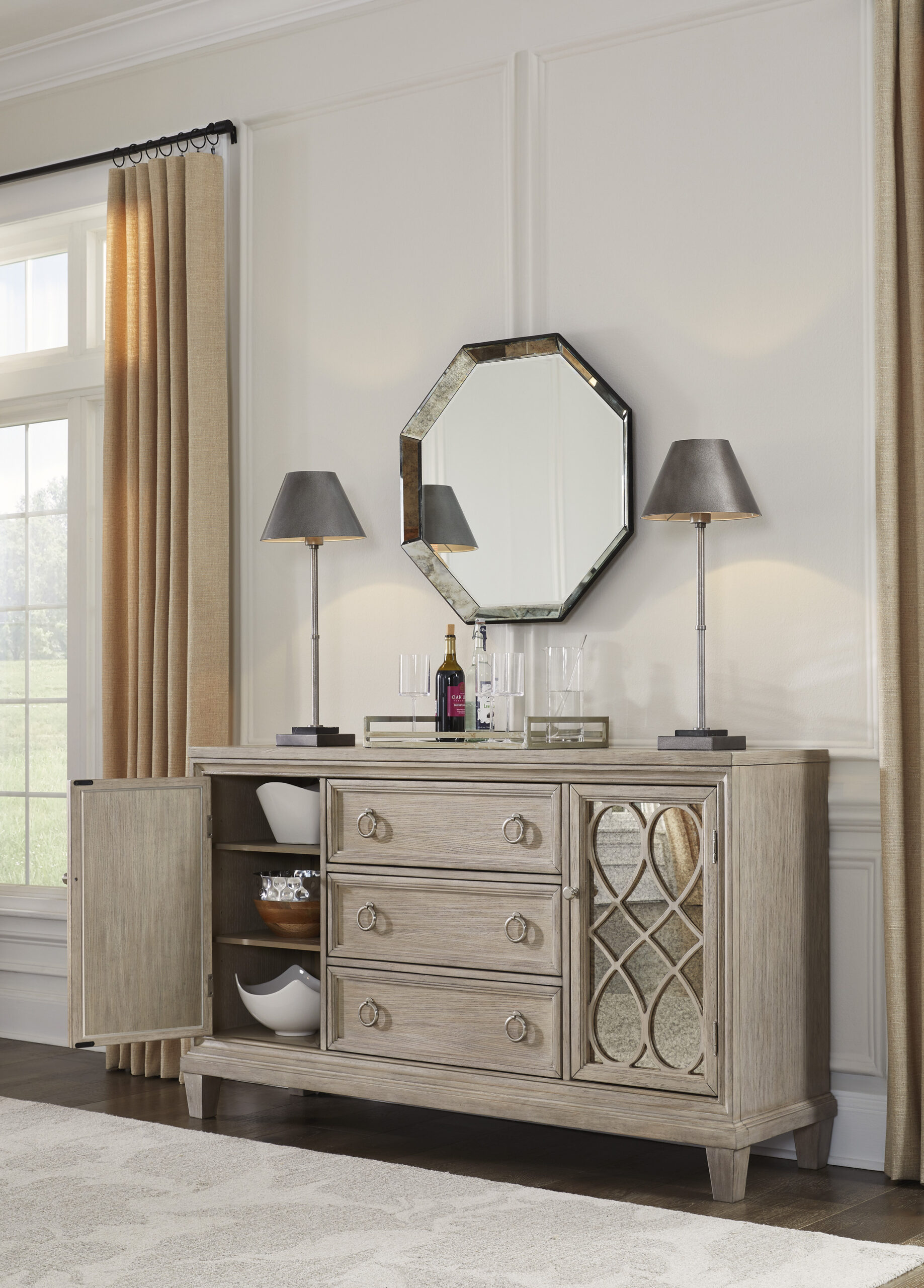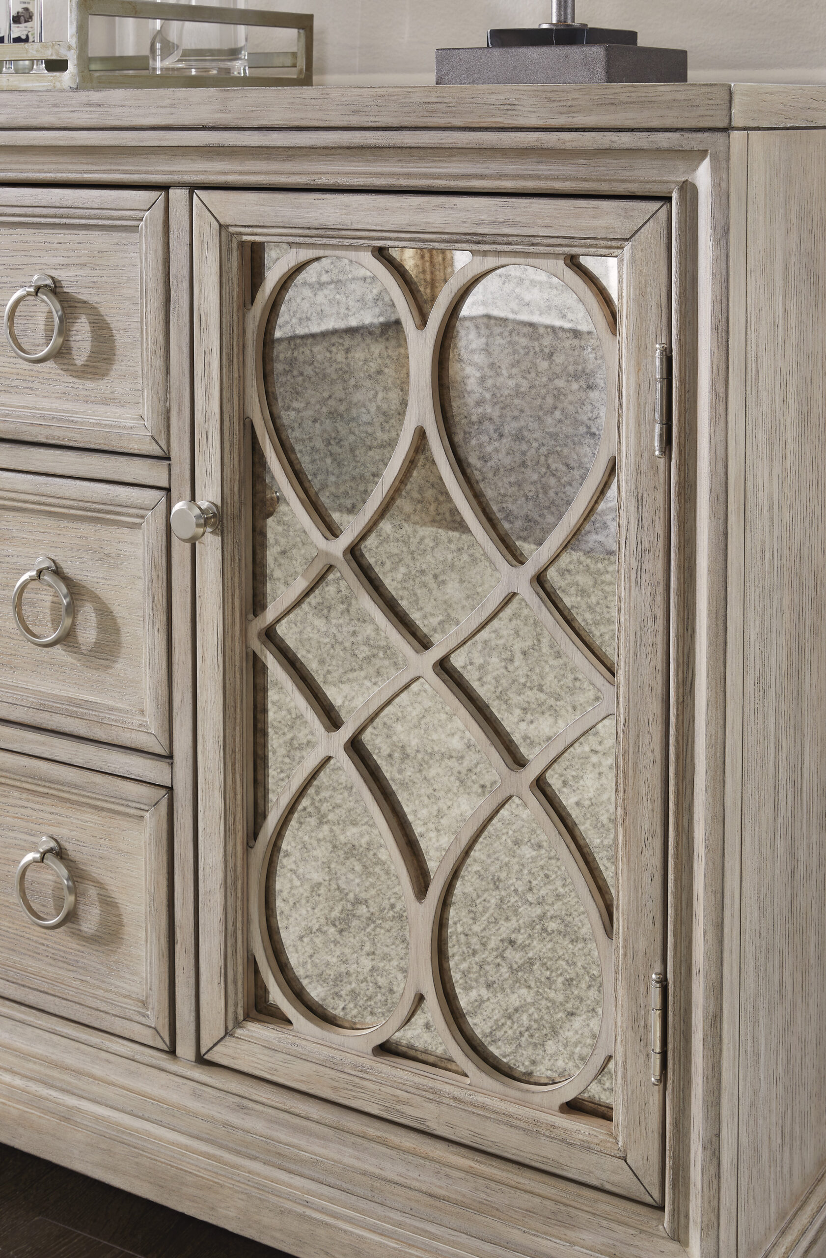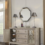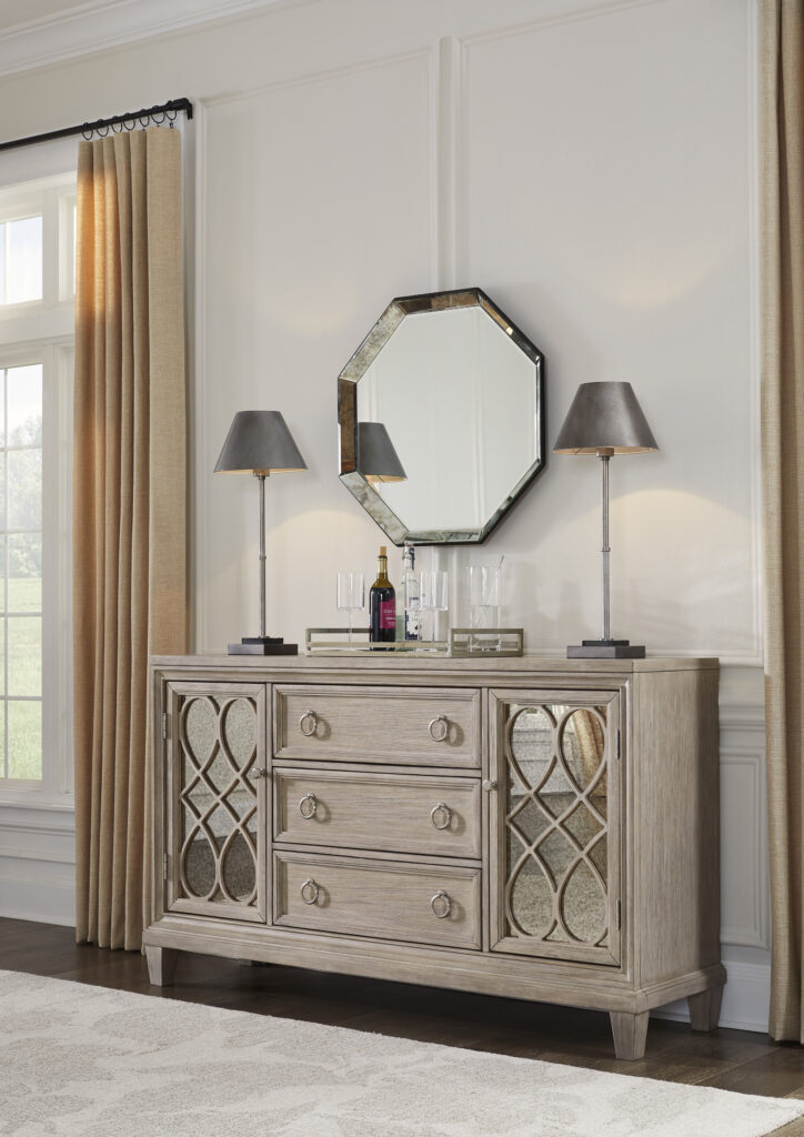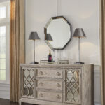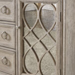 Art deco stiliaus komoda Jorlaina, tai baldas, kuris išryškina savo unikalius fasadinius elementus ir pabrėžia savo išvaizdą sendintais raižiniais ir veidrodžiais.